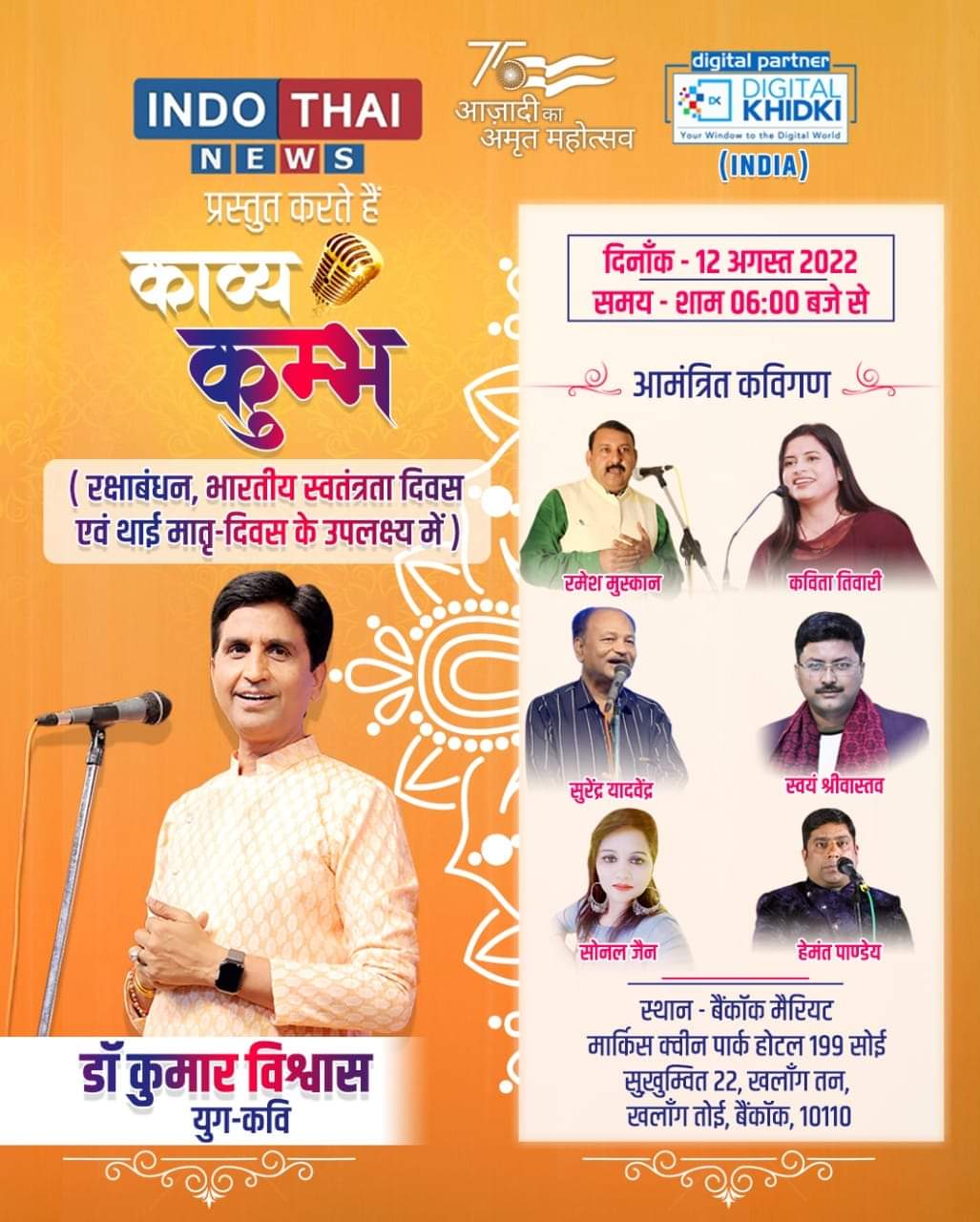 भारतीय संस्कृति पुरातन काल से ही विभिन्न देशों की सांस्कृतिक व साहित्यिक विविधताओं के आदान-प्रदान का केंद्र रही है। आज उसी परंपरा को आगे बढ़ाते हुए भारतीय हिंदी साहित्य के जाने-माने कवियों का एक समूह इंडो थाई संस्कृति को आगे बढ़ाने के लिए कवि सम्मेलन में प्रतिभाग करने के लिए थाईलैंड जा रहा है। आगामी 12 अगस्त को इंडो थाई न्यूज व डिजिटल खिड़की के संयोजन में देश के सुविख्यात कवि कुमार विश्वास, स्वयं श्रीवास्तव, रमेश मुस्कान, कविता तिवारी, हेमंत पांडे,सुरेंद्र यादवेंद्र व सोनल जैन कविता पाठ करेंगे।